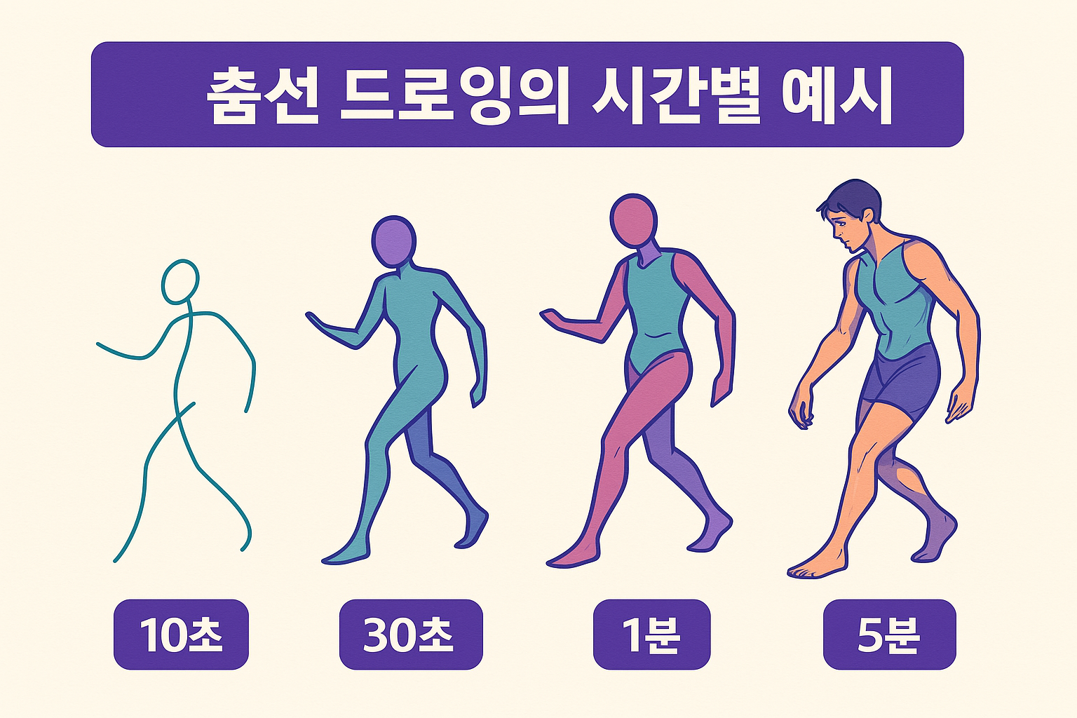 ⏱️ 제스처 드로잉은 ‘선으로 생각하는 사고방식’을 기르기 위한 최고의 연습이에요. 형태보다 에너지 흐름에 집중해요!